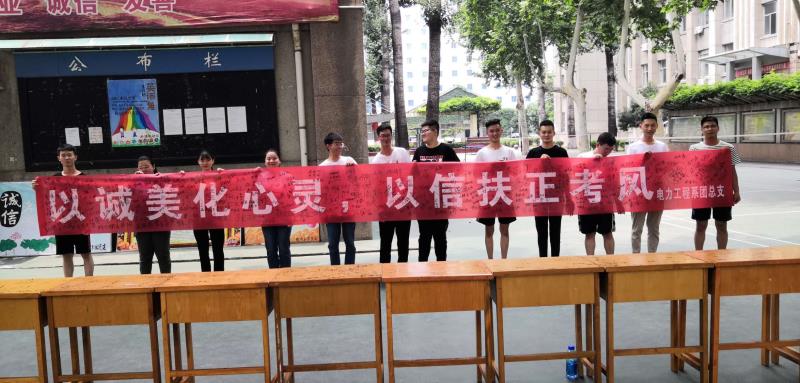 为了进一步规范我校学生考试期间纪律,规范校园秩序,加强学生的自主学习意识,创建一个健康文明的校园生活。6月26日中午12:30—1:00电力系团总支在南北教学楼之间开展了“ 以诚美化心灵,以信服振考分”诚信考试签名活动;倡导我们从心里开始留存“诚信考试,诚实做人”的意识,从现在做起,做一个诚实守信的大学生。