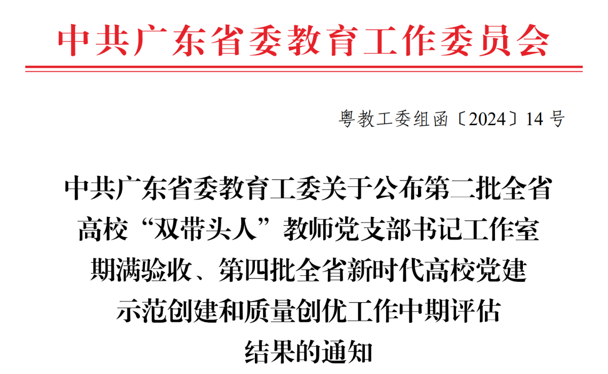 根据《中共广东省委教育工委关于公布第二批全省高校“双带头人”教师党支部书记工作室期满验收、第四批全省新时代高校党建示范创建和质量创优工作中期评估结果的通知》,我院智能交通专任教师党支部顺利通过“样板支部”中期评估验收。