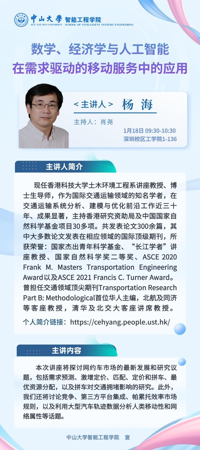 学术讲座 | 杨海:"数学、经济学与人工智能在需求驱动的移动服务中的应用”的学术报告讲座