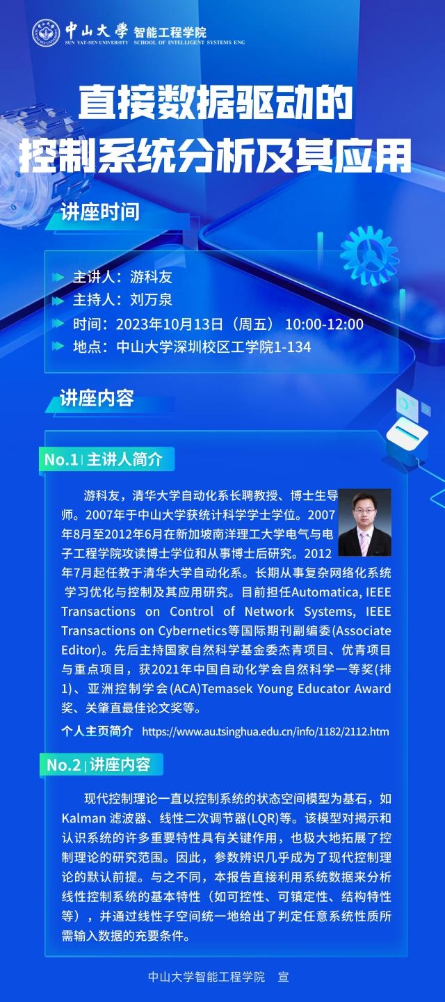 2023年10月13日上午10点,我院举办“直接数据应用控制理论与应用”主题学术讲座,讲座在深圳校区工学园1栋134举行。