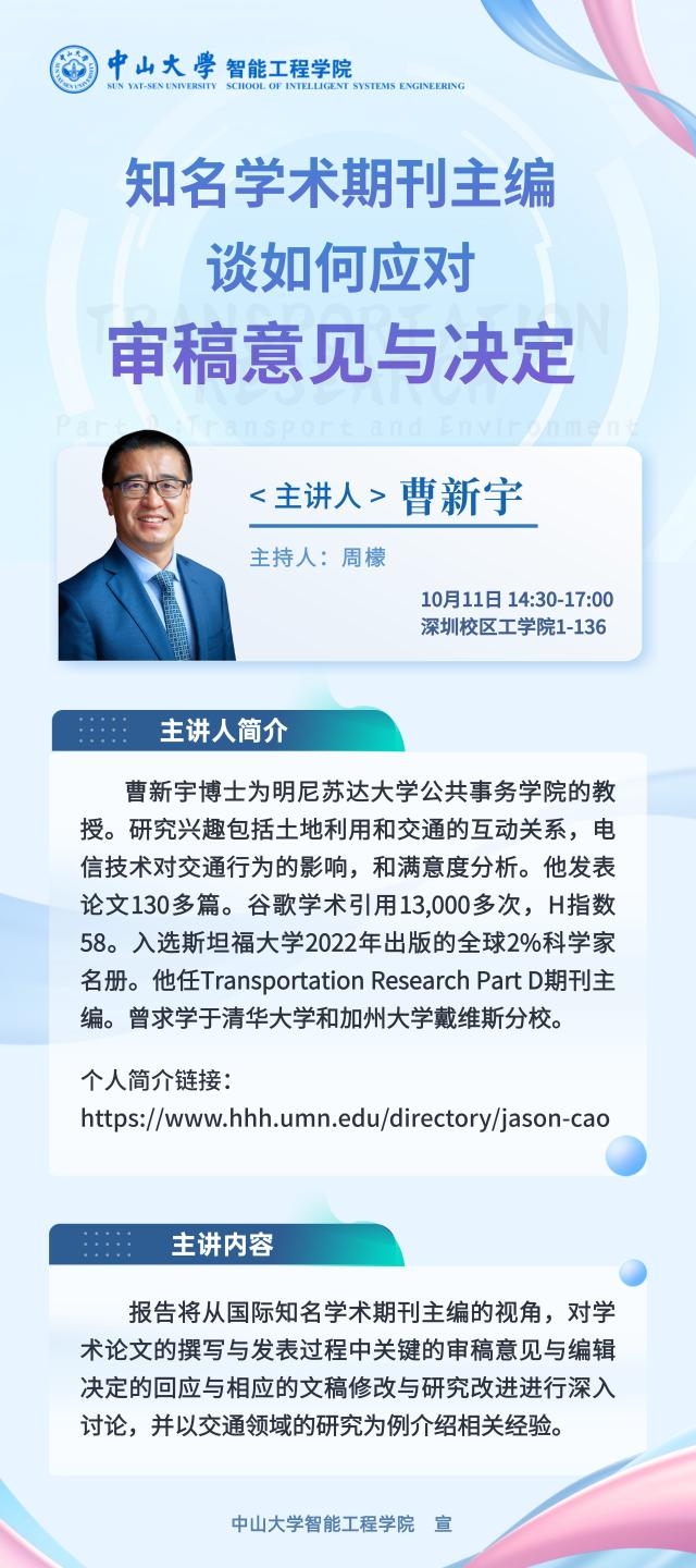 2023年10月11日下午,我院举办“知名学术期刊主编谈如何应对审稿意见与决定”主题学术讲座,讲座在深圳校区工学园1栋136举行。