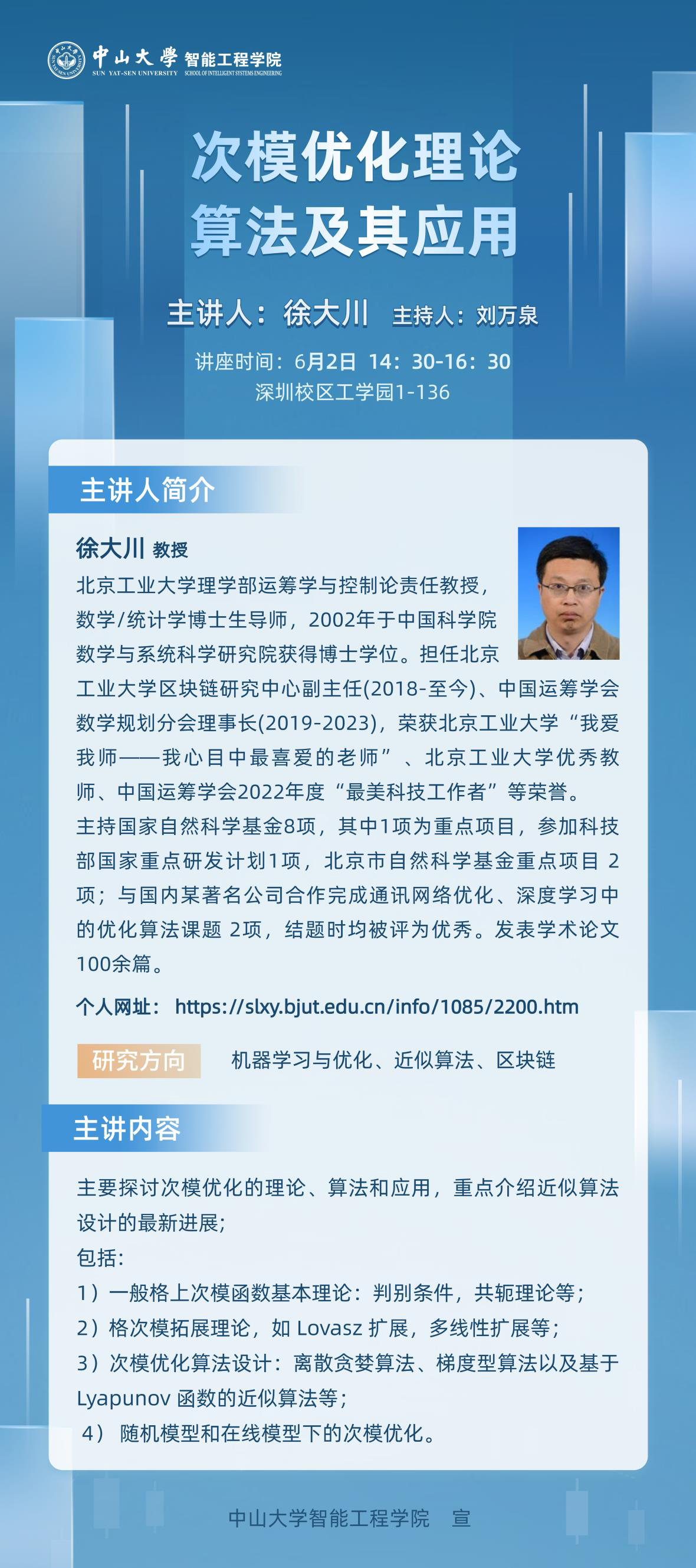 导航痕迹 首页 2023年248cc永利集团学术讲座第十一期“次模优化理论算法及其应用” 2023年248cc永利集团学术讲座第十一期“次模优化理论算法及其应用” 次模优化理论算法及其应用 发布日期:2023-05-31 最新讲座 学术讲座 | 陈波立:"面向智慧城市感知、监测和控制的多智能体系统Multi-Agent Systems for Sensing, Monitoring, and Control in Smart Cities”的学术报告讲座2025-07-28 学术讲座 | 杨在:"Carathéodory-Fejér定理与信号频谱分析”的学术报告讲座2025-07-28 学术讲座 | 荣建:"交通工程学知识体系重构:从人内机理到系统优化的研究进展”的学术报告讲座2025-06-24 学术讲座 | 施阳:"自主智能机电系统的先进鲁棒模型预测控制框架”的学术报告讲座2025-05-20 学术讲座 | 占曙光:"高速铁路列车运行调整优化研究”的学术报告讲座2025-03-28