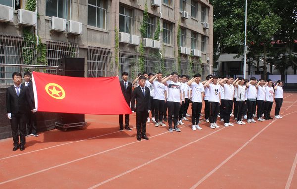 庄严的国歌拉开了大会的帷幕。校团委书记首先宣读学校五四表彰决定,共有5个“五四红旗团支部”、10名“美德青年”、20名“优秀共青团干部”、20名“优秀志愿者”、100名“优秀共青团员”受到表彰,获奖者光荣地在主题宣传墙“青春心向党、建功新时代”上集体签名留念,并接受了参会领导颁发的荣誉证书和祝贺。极大地增强了获奖者的荣誉感,激发了广大团员青年的奋进目标与热情。“出团旗”是此次颁奖典礼一个重要环节。随着激昂配乐诗朗诵,鲜艳的团旗在40名优秀团员的护送下迎风走过主席台;四名护旗手将团旗面向所有团员青年展开;40名优秀团员握拳举起右手紧靠在团旗左侧整齐排列成三行,1000余名团员集体重温入团誓词将大会推向高潮。