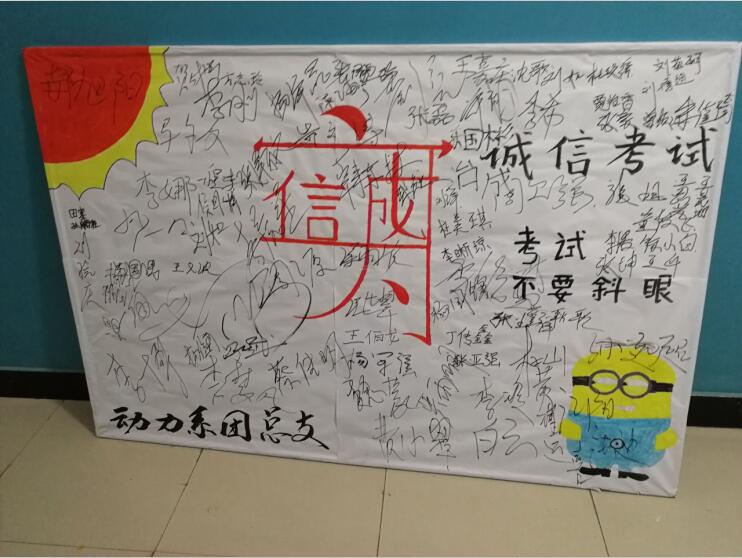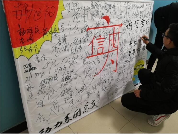 诚信不仅是一种品行,更是一种责任。诚信是一个正直的人应具备的品质,更应是每个学习者所应遵守的准则。期末考试临近,为了排除外界干扰,使同学们能进入复习状态,树立良好的考风、考纪,进一步规范学校考试工作,提高同学们自身素质,使同学们充分利用一切时间去努力复习,诚信考试。在2017年12月21日下午,由我系团总支组织动力系全体同学在南北楼之间展开了一场以主题为“诚信考试”的签名活动,本次活动充分调动了同学们的积极性,弘扬了诚实守信的良好风气,正确树立了使同学们与不良风气做斗争的坚定信念,为此次活动画上了圆满句号。