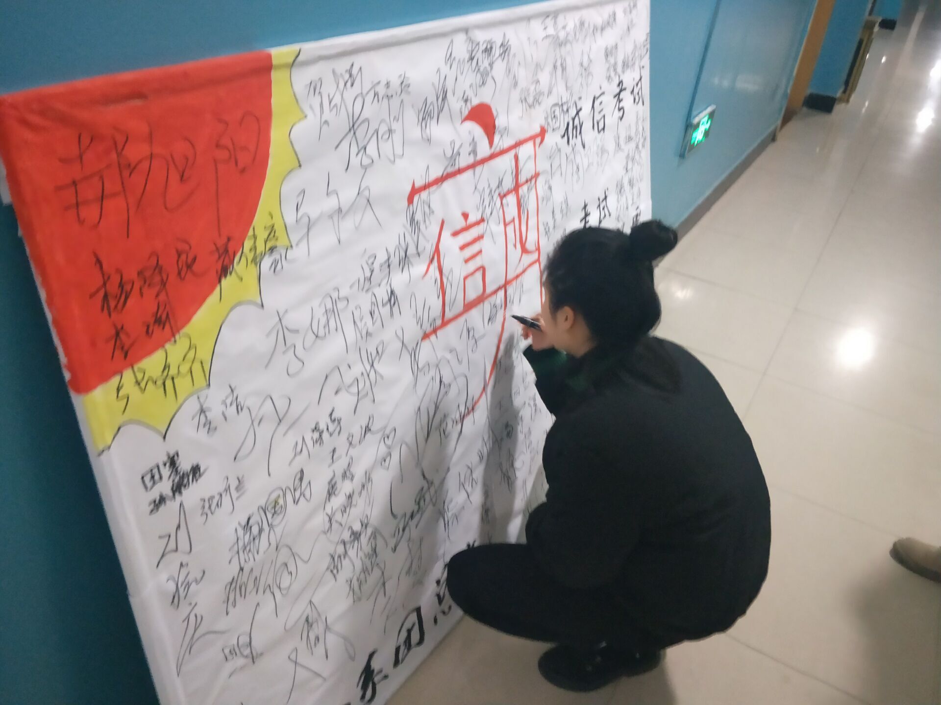本次活动在我校大学生中间倡导和弘扬了诚实守信的良好风气,为我校营造了健康和谐的校园环境和文化氛围,使同学们更加深刻明白诚实守信的重要性,更加遵守诚信考试,诚信做人,诚信做事的准则。活动当天,动力系全体同学纷纷在展板上写下“诚信面对考试,杜绝考试作弊”的誓词,各班委以班级为单位向同学们传达考试的规章制度,阐述了诚信守信的重要性,号召同学们在“倡导诚信考试,建立和谐校园”的展板上认真签下自己的名字,以表达自己在即将来临的期末考试中“必将以实际证明自己”的决心。各自以班级为单位写出了一份诚信承诺书,全体同学在承诺书上重重的写下了自己发自内心的承诺。可谓是志气昂扬,炫歌一堂啊!