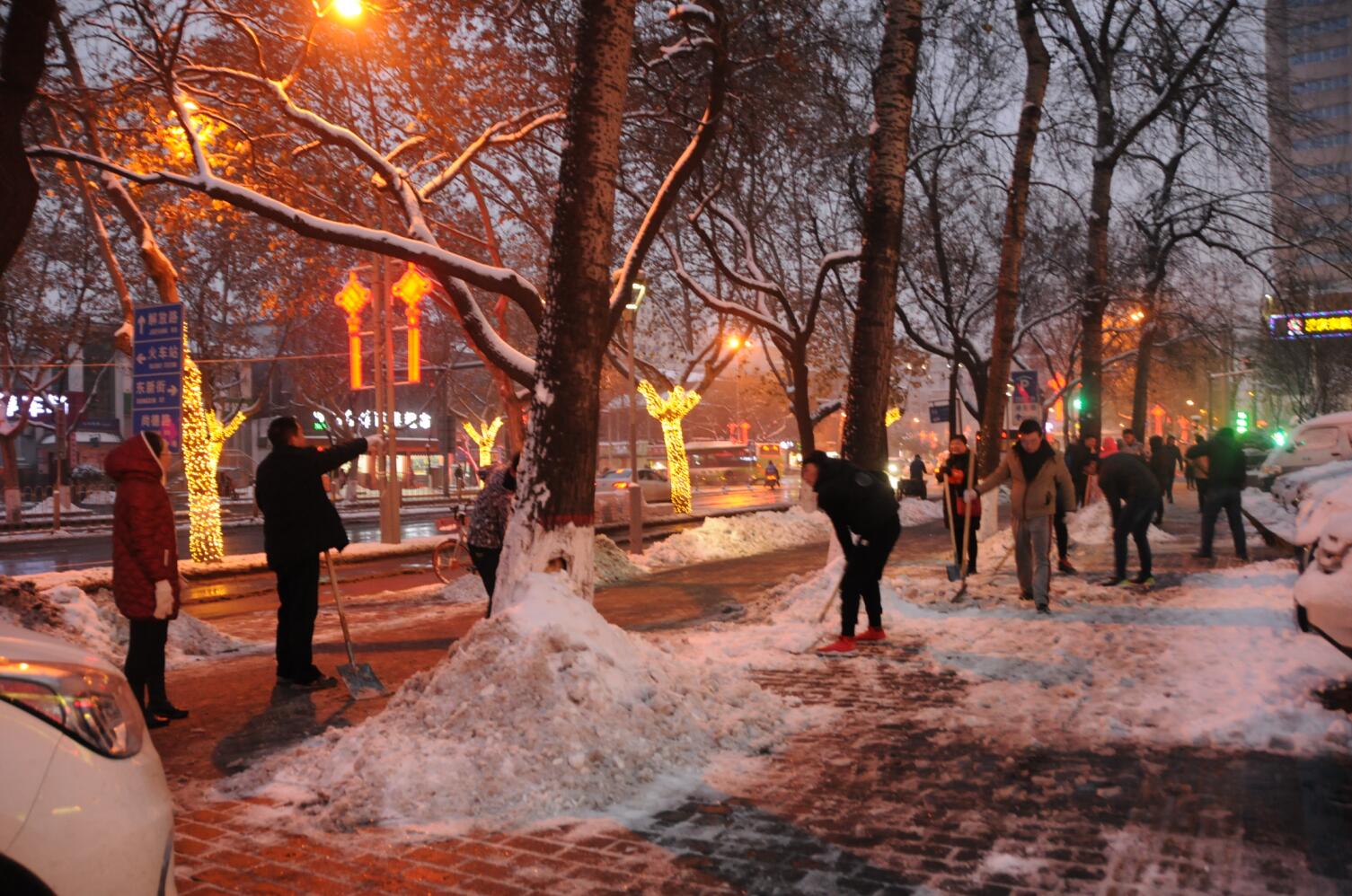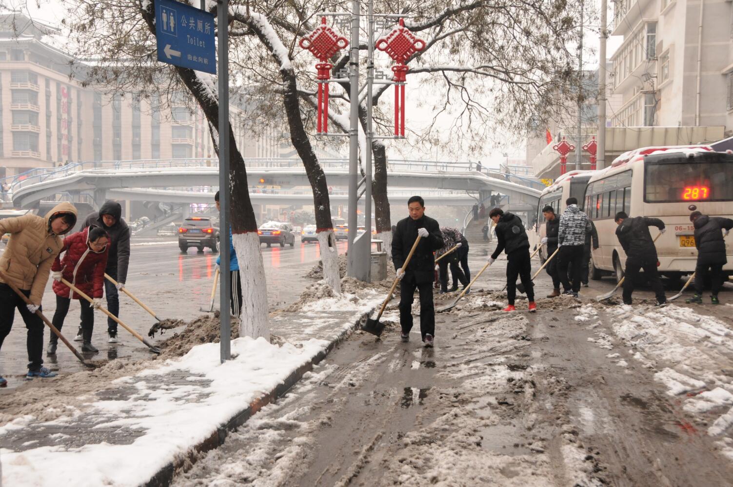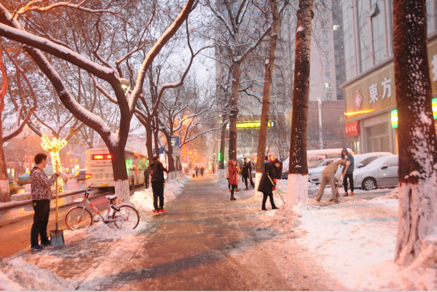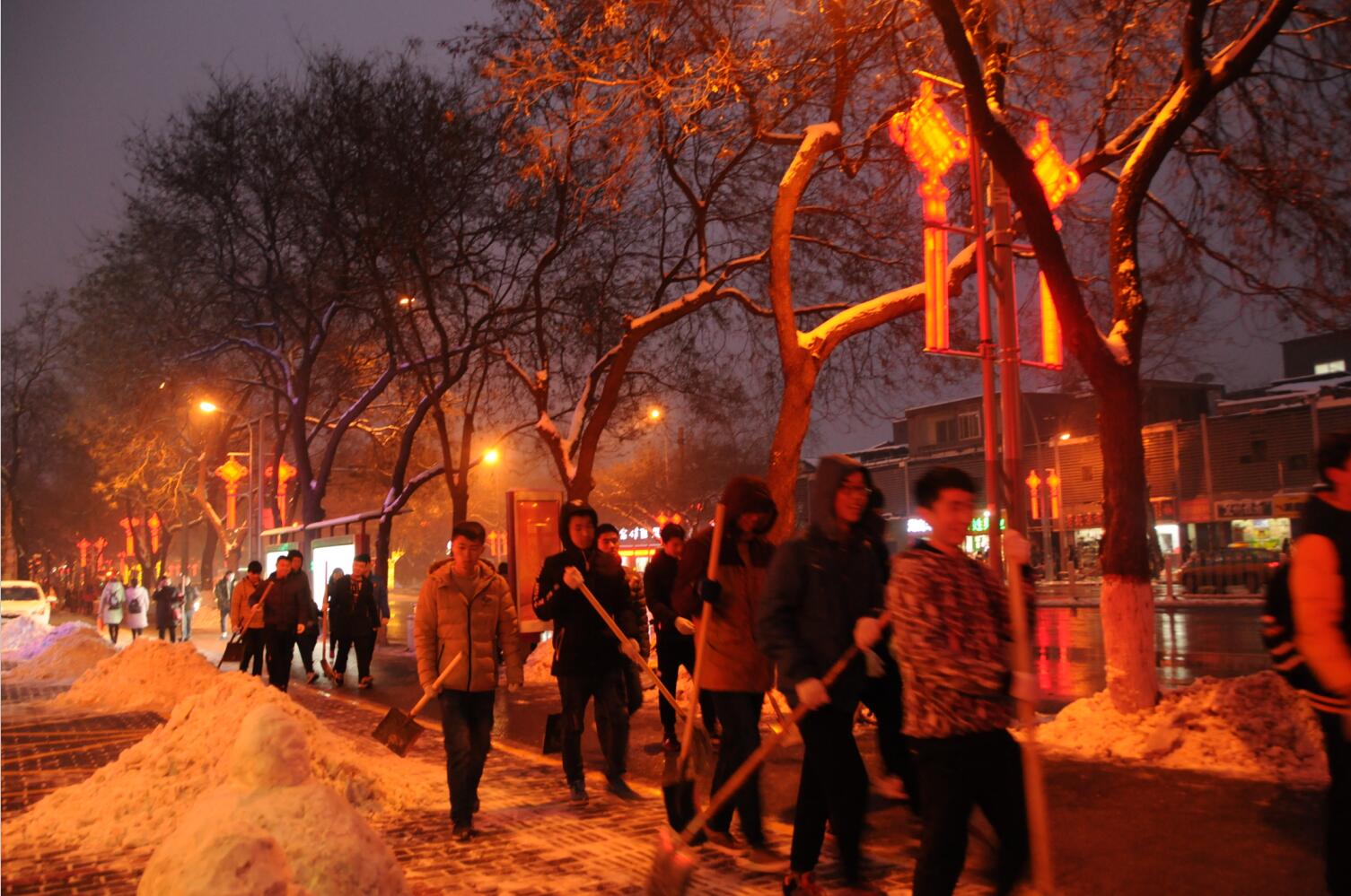 在杜卫庆、杨海伏两位老师的带领下,志愿者们顶着凛冽的寒风,冒着鹅毛大雪,中午2点准时从学校出发,步行至解放路民乐园街道,对五路口到北大街之间的交通主干道进行了积雪的清理。保证行人出行及交通运行。凛冽的寒风呼呼地吹着,但这并不能阻挡我们电专人高涨的热情,同学们在两位老师的带动下纷纷拿起手中的工具开始清扫,不畏严寒,积极主动、相互配合、齐心协力,挥舞着铁锹和笤帚,你铲我扫,一派热火朝天的景象,一点点地将积雪和冰层铲起集中堆放,尽管大家的脸都冻得通红通红,但手中的扫雪工具却不停地挥舞着,寒冷中冒起热汗,雪水湿透了皮鞋。道路上车辆依旧行驶着,同学们也丝毫不顾溅起的脏水弄脏自己的衣服。