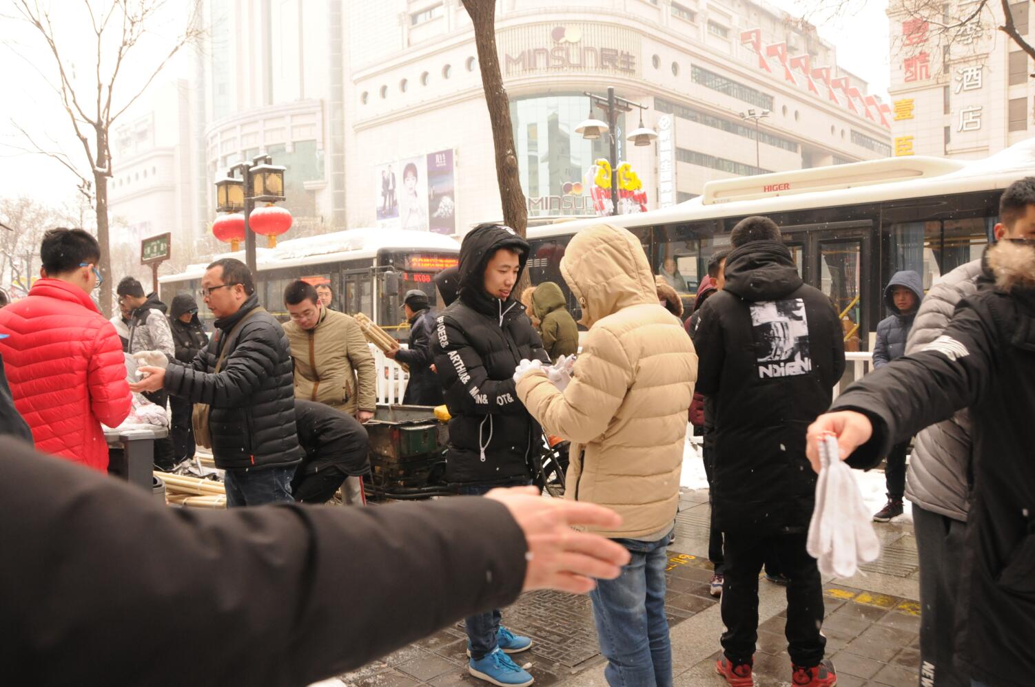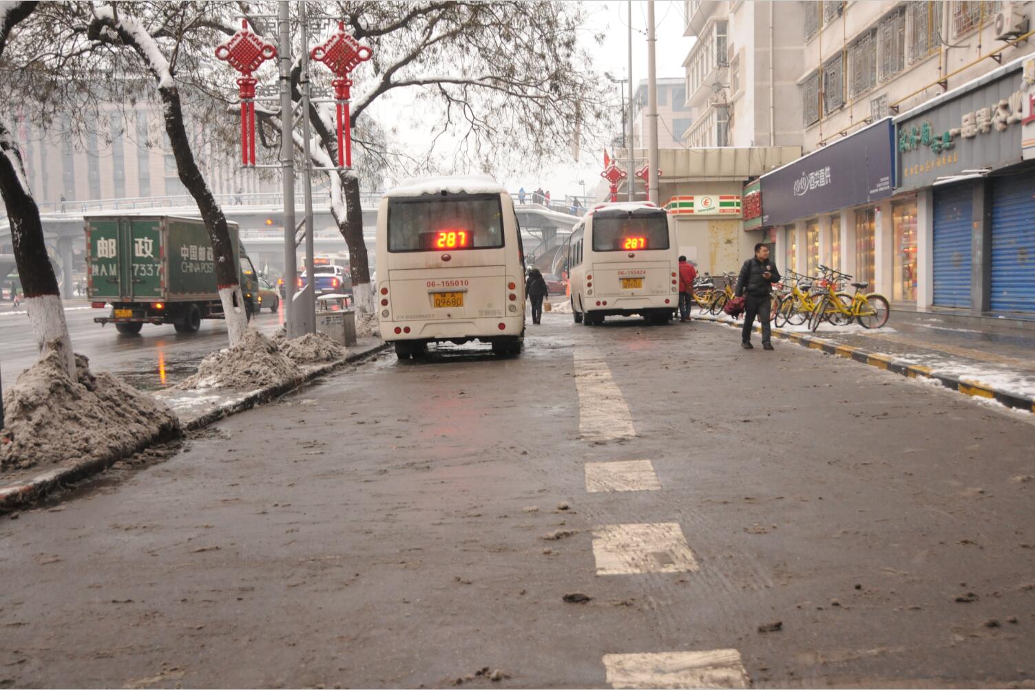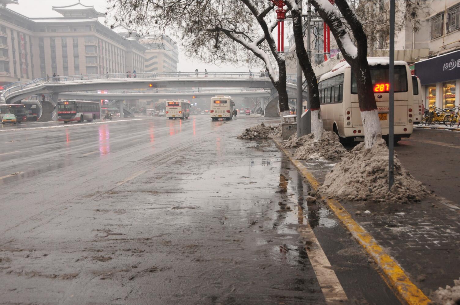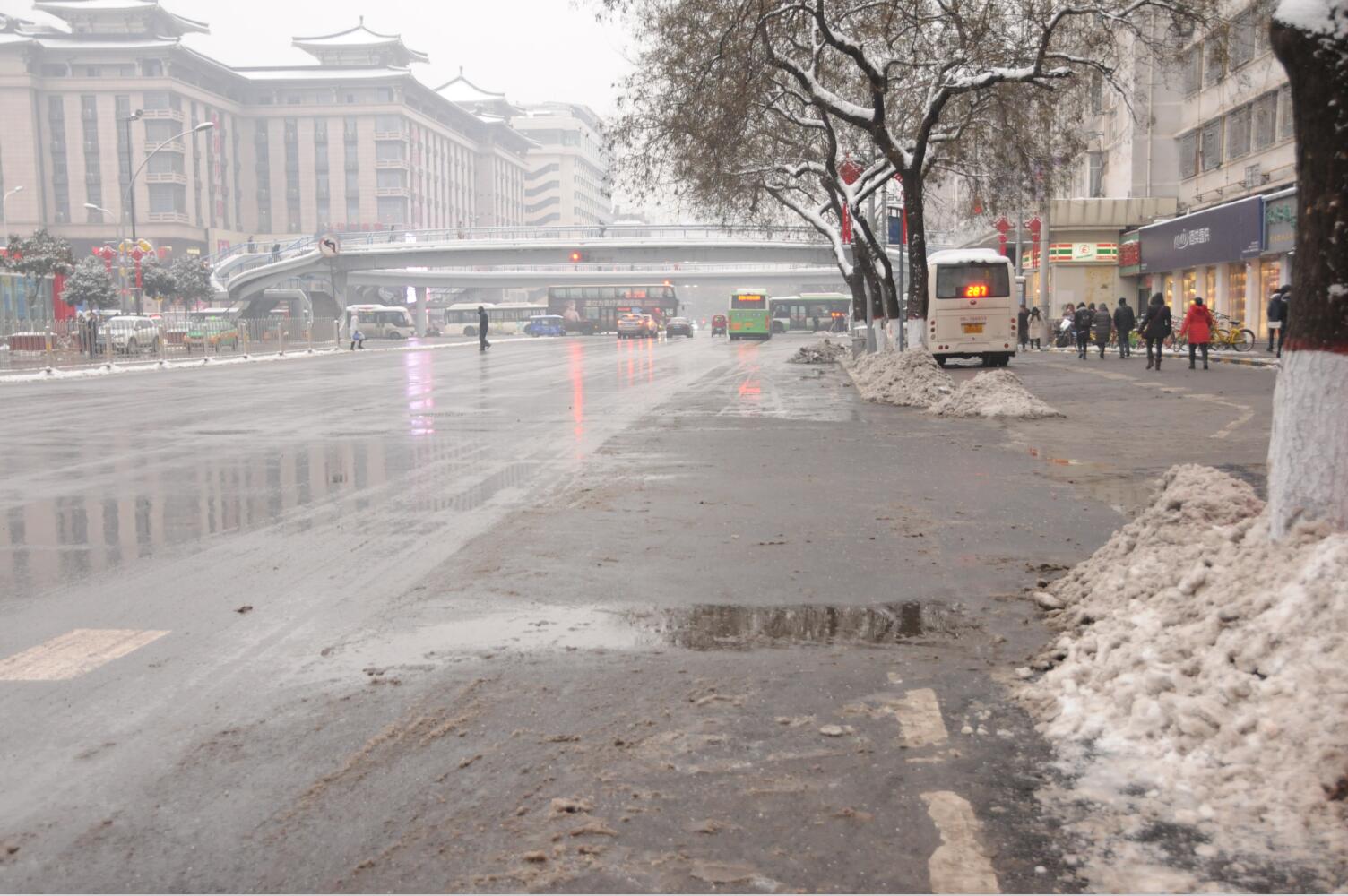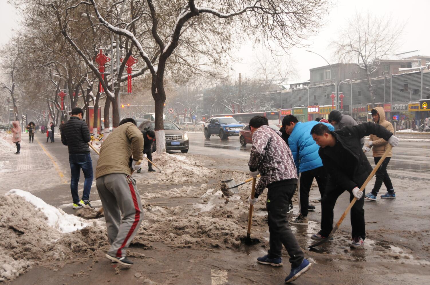 在杜卫庆、杨海伏两位老师的带领下,志愿者们顶着凛冽的寒风,冒着鹅毛大雪,中午2点准时从学校出发,步行至解放路民乐园街道,对五路口到北大街之间的交通主干道进行了积雪的清理。保证行人出行及交通运行。凛冽的寒风呼呼地吹着,但这并不能阻挡我们电专人高涨的热情,同学们在两位老师的带动下纷纷拿起手中的工具开始清扫,不畏严寒,积极主动、相互配合、齐心协力,挥舞着铁锹和笤帚,你铲我扫,一派热火朝天的景象,一点点地将积雪和冰层铲起集中堆放,尽管大家的脸都冻得通红通红,但手中的扫雪工具却不停地挥舞着,寒冷中冒起热汗,雪水湿透了皮鞋。道路上车辆依旧行驶着,同学们也丝毫不顾溅起的脏水弄脏自己的衣服。