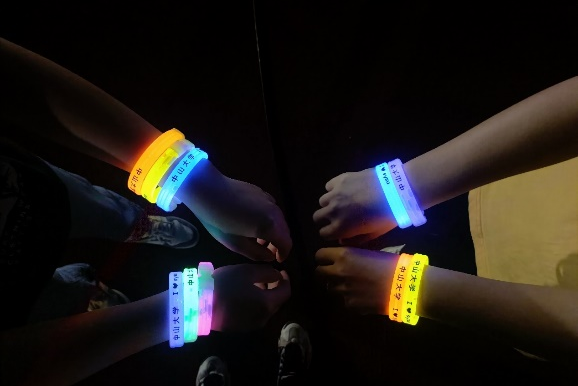 向各个学院的同学们分发荧光手环,让手环点亮了整个操场!