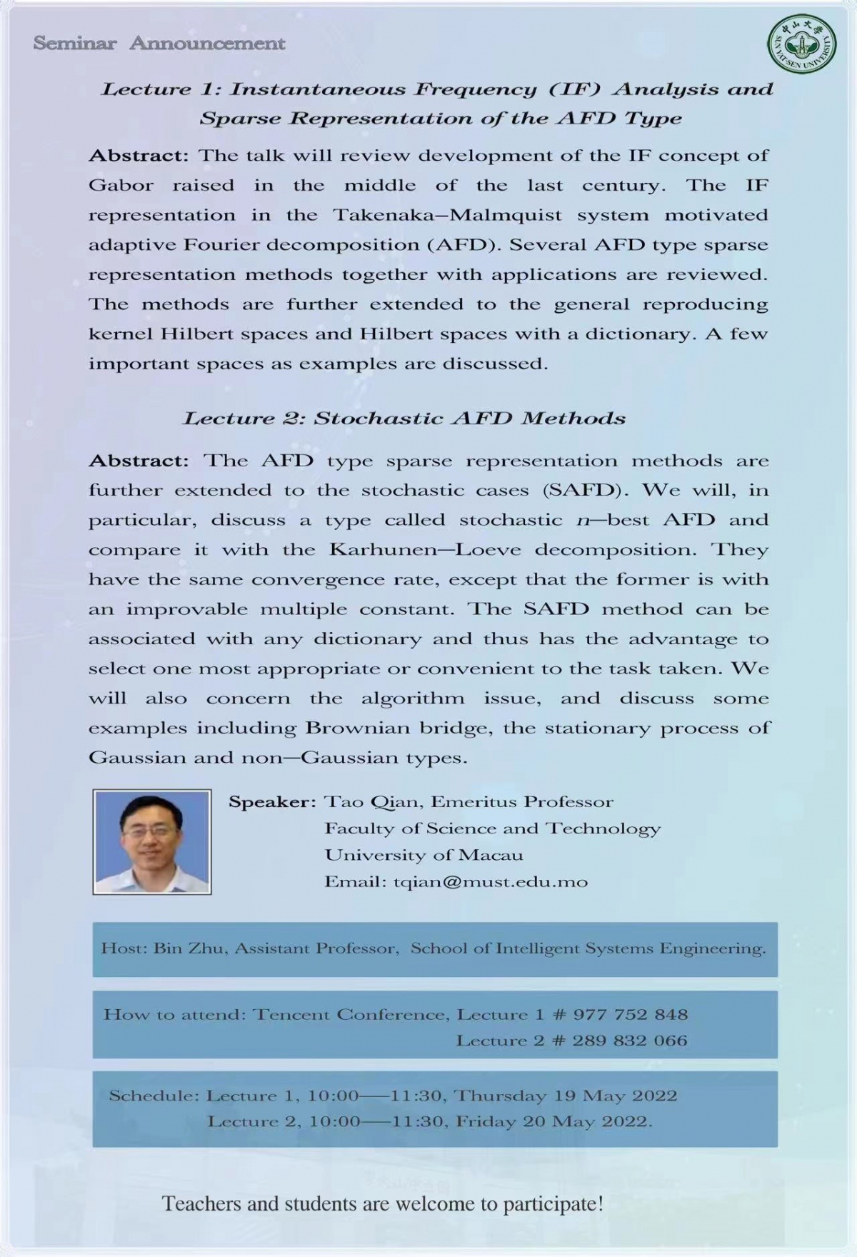 2022年5月19日上午和5月20日上午,澳门科技大学钱涛教授应邀为我院师生举行了两次专题学术讲座,分别围绕“瞬时频率分析和自适应傅里叶分解的稀疏表示”和“随机自适应傅里叶分解方法”两个主题,为我院师生分享了其在调和分析、信号处理等领域的独到见解和突出研究。会议由我院朱彬助理教授主持,以视频会议的形式在线上举行。