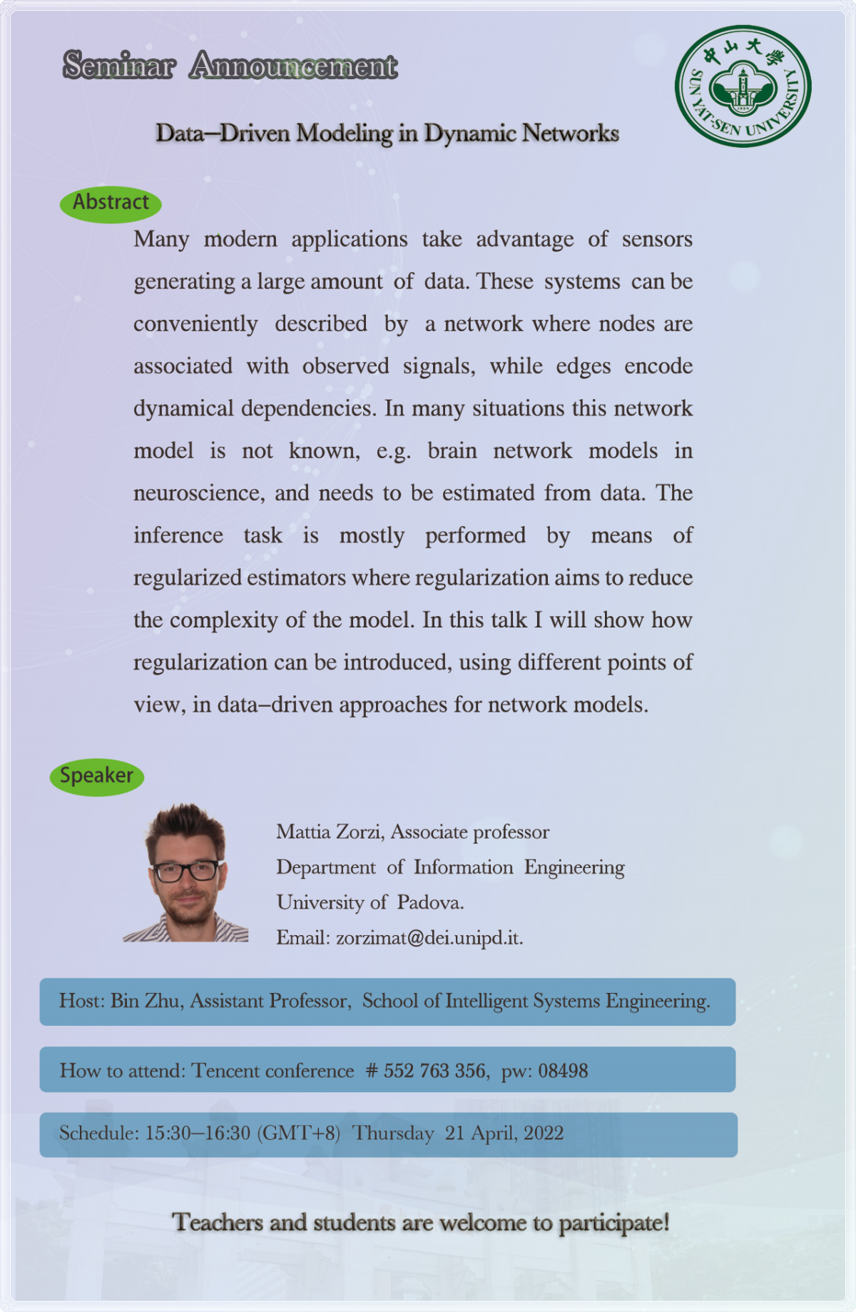 2022年4月21日星期四下午,意大利帕多瓦大学副教授Mattia Zorzi应邀,为我院师生举行了主题为“动态网络中的数据驱动建模”的学术讲座,讲座以视频会议的方式举行,由我院朱彬助理教授主持。