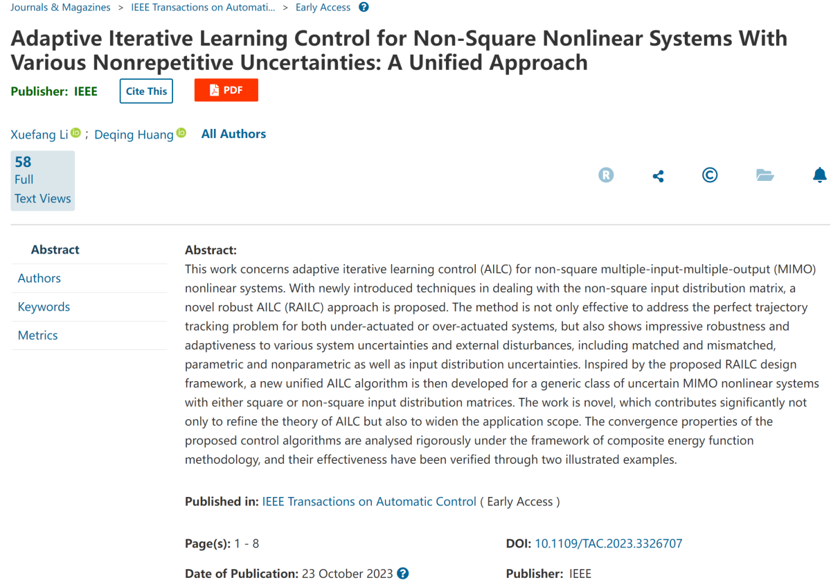 248cc永利集团李雪芳副教授在控制学科国际权威期刊IEEE TAC上连续发表迭代学习控制研究成果