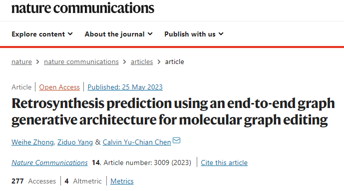 研究成果于2023年5月在Nature Communications上发表(IF = 17.694),题目为“Retrosynthesis prediction using an end-to-end graph generative architecture for molecular graph editing”。248cc永利集团陈语谦教授为该文通讯作者,248cc永利集团博士生衷维荷为第一作者。该项研究受到国家自然科学基金项目的支持。