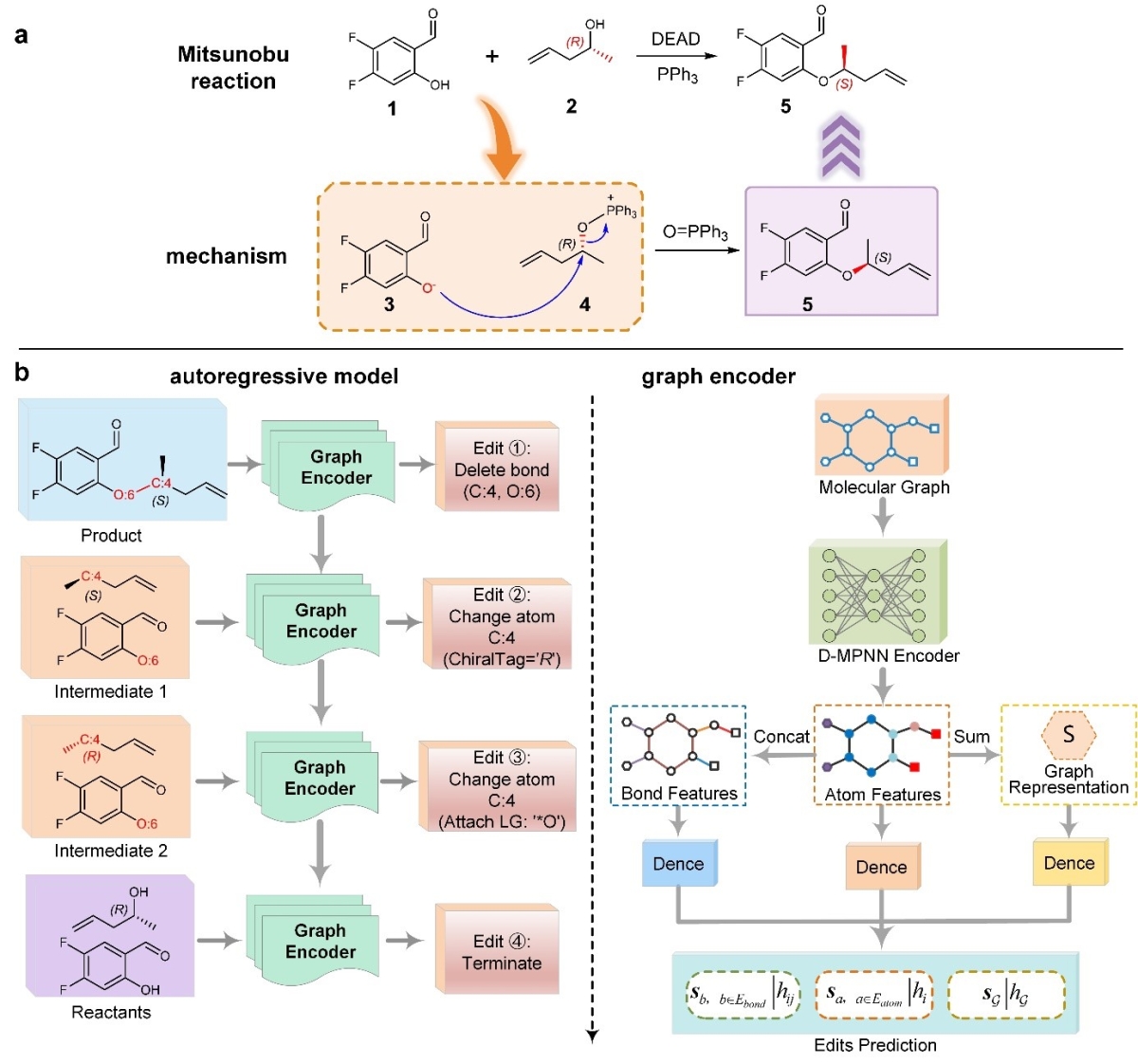 Graph2Edits的设计动机(简化的反应机理)与整体架构