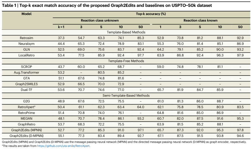 实验表明,与基准模型相比,Graph2Edits在不同评估方法中实现了更高的逆合成预测精度,top-1精确匹配精度达到了55.1%,能够有效地搜索合理反应的潜在空间,显示出在复杂反应中优秀的适用性和泛化能力,提高了预测结果的多样性和可解释性。