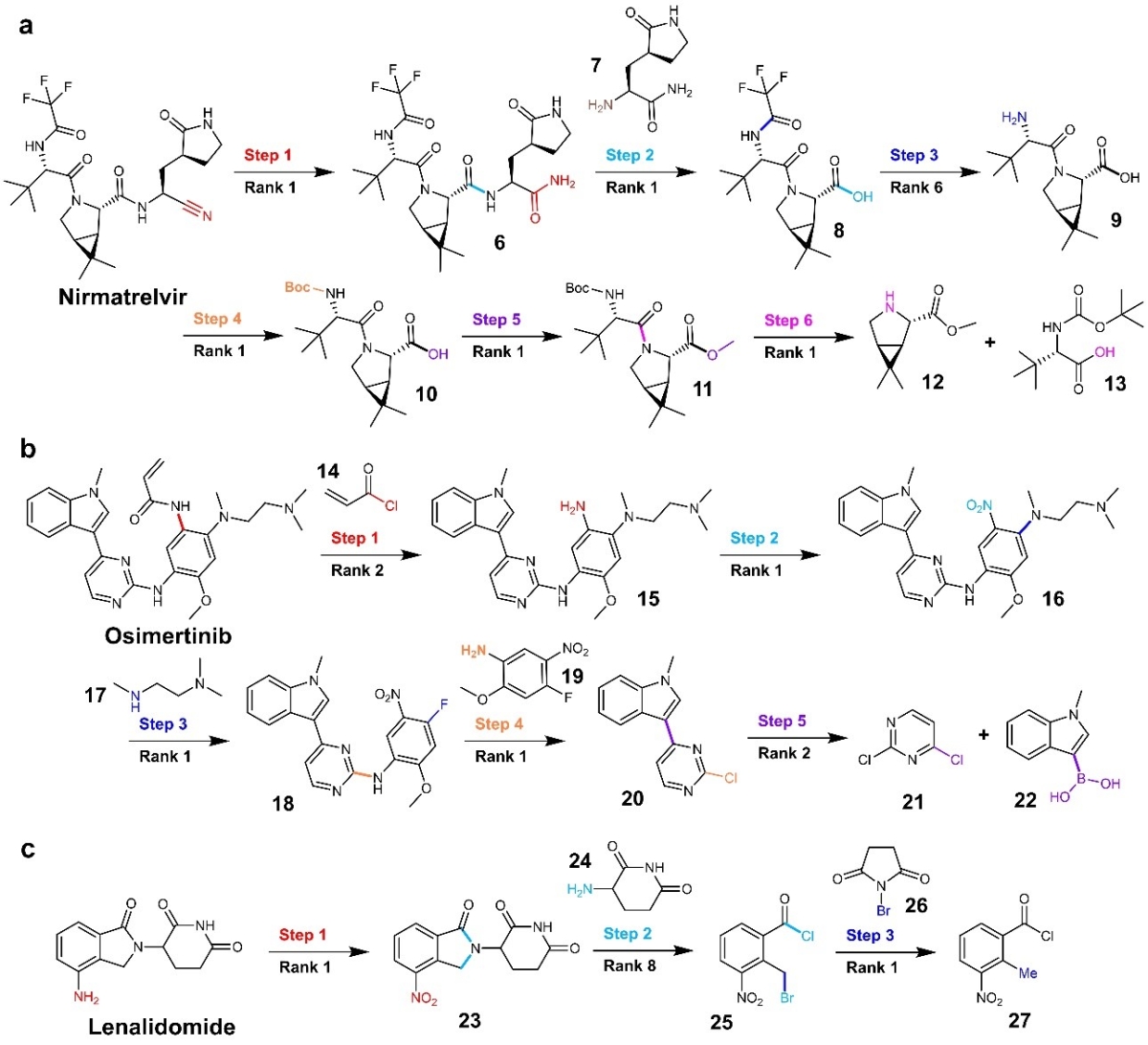 为了验证模型在合成路线规划中的实际用途,该研究选择了3个重磅药物分子作为例子进行合成路线的设计,包括用于治疗COVID-19的口服SARS-CoV-2 Mpro抑制剂奈玛特韦(Nirmatrelvir),用于治疗非小细胞肺癌的第三代EGFR抑制剂奥希替尼(Osimertinib)和用于治疗多发性骨髓瘤的来那度胺(Lenalidomide)。结果显示,Graph2Edits模型成功地预测了这些药物分子的完整合成路线,验证了其在分子的多步逆合成路线设计中潜在的实际应用价值。