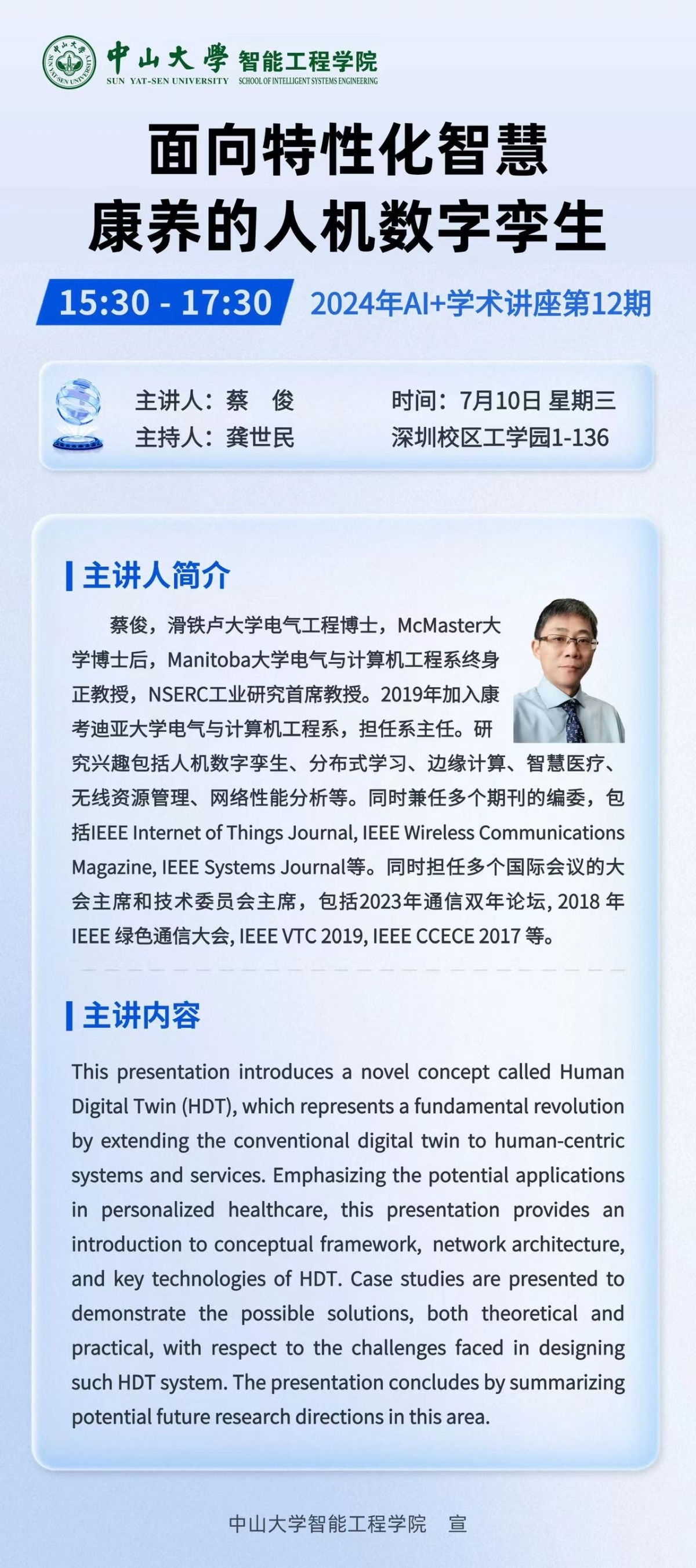 学术讲座 | 蔡 俊:"面向特性化智慧 康养的人机数字孪生”的学术报告讲座