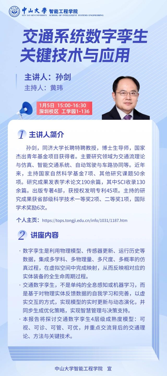 导航痕迹 首页 学术讲座 | 孙剑:“交通系统数字孪生关键技术与应用” 学术讲座 | 孙剑:“交通系统数字孪生关键技术与应用” 交通系统数字孪生关键技术与应用 发布日期:2024-01-15 最新讲座 学术讲座 | 陈波立:"面向智慧城市感知、监测和控制的多智能体系统Multi-Agent Systems for Sensing, Monitoring, and Control in Smart Cities”的学术报告讲座2025-07-28 学术讲座 | 杨在:"Carathéodory-Fejér定理与信号频谱分析”的学术报告讲座2025-07-28 学术讲座 | 荣建:"交通工程学知识体系重构:从人内机理到系统优化的研究进展”的学术报告讲座2025-06-24 学术讲座 | 施阳:"自主智能机电系统的先进鲁棒模型预测控制框架”的学术报告讲座2025-05-20 学术讲座 | 占曙光:"高速铁路列车运行调整优化研究”的学术报告讲座2025-03-28