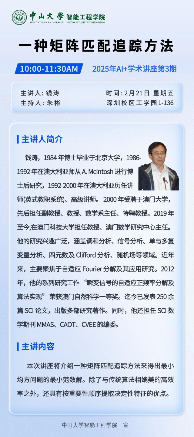 2025年2月21日上午10点,我院举办“一种矩阵匹配追踪方法”主题学术讲座,讲座在深圳校区工学园1栋136举行。