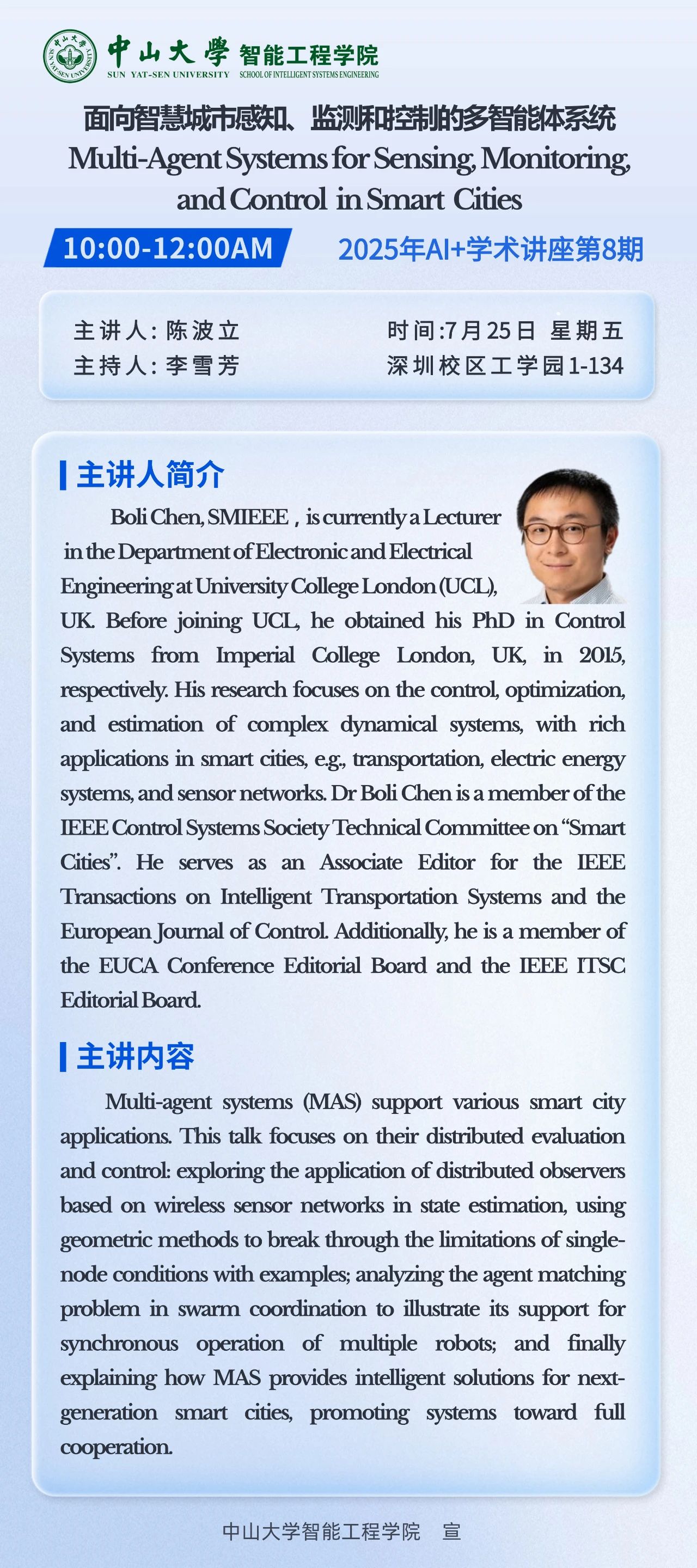 2025年7月25日上午10点,我院举办“面向智慧城市感知、监测和控制的多智能体系统Multi-Agent Systems for Sensing, Monitoring, and Control in Smart Cities”主题学术讲座,讲座在深圳校区工学园1栋134举行。